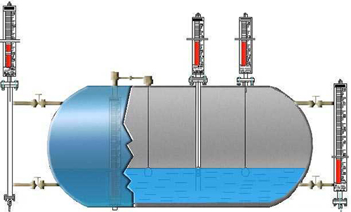 磁翻板液位計測量液體時采用頂裝或旁通管側裝方式。磁翻柱主體外加裝翻柱液位指示器、液位開關及液位變送器。磁單元置于浮球內部或通過頂桿與浮球相連,當浮球連帶磁單 元隨液位變化時,使磁性色塊(磁翻板)翻轉;磁性液位開關在對應液位點動作;同時液位傳感器在浮球磁力的作用下,輸出標準的變化電阻信號,再經過變送器把電阻信號轉換 成4~20mA電流信號輸出。