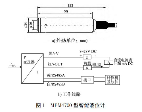 頂裝型磁翻板液位計以微處理器為核心單元,具有檢測、判斷和信息處理功能。其測量水位的基本原理是利用半導(dǎo)體硅材料的壓阻效應(yīng),實(shí)現(xiàn)液位壓力與電信號的轉(zhuǎn)換[2]。即把與液體深度成正比的液體靜壓力,通過液位計( 變送器) 轉(zhuǎn)換成電流信號輸出,從而建立輸出電信號與液體深度的線性對應(yīng)關(guān)系,實(shí)現(xiàn)對液位( 水位) 的測量。沉箱水位監(jiān)測選用MPM4700 型頂裝型磁翻板液位計,該液位計以擴(kuò)散硅壓阻式傳感器為管芯,集成變換器電路、微處理芯片為一體,其性能穩(wěn)定,結(jié)構(gòu)緊湊,外圍線路簡單。該液位計為四線制,可同時輸出一組4 ~ 20 mA 的標(biāo)準(zhǔn)電流信號和RS486 數(shù)字信號。MPM4700 型智能