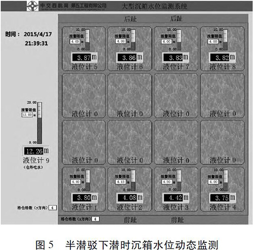 漳州后石港區(qū)3 號泊位碼頭工程采用重力式沉箱結(jié)構(gòu),該工程沉箱共15 件,單件質(zhì)量4 365 t,沉箱長、寬、高分別為19. 8、21. 9 、25. 0 m; 沉箱分7 層澆筑,澆筑*頂層時3# 格倉按設(shè)計圖紙預(yù)留3 m 高的缺口。在漳州預(yù)制廠預(yù)制,沉箱安裝施工現(xiàn)場距離預(yù)制廠約6. 3 km。沉箱采用氣囊橫移至出運(yùn)通道,再縱移至出運(yùn)碼頭前沿線上駁,采用8 000 t 半潛駁下潛安裝。根據(jù)浮游穩(wěn)定計算,沉箱各格倉壓載水見圖4。2#、6# 格倉為3. 98 m,3#、7#格倉為4. 34 m,其余格倉為3. 80 m,沉箱倉外吃水12. 15 m。根據(jù)當(dāng)?shù)厮恼境毕恚?015-04-17T20∶30 下潛坑潮位條件符合下潛要求,半潛駁在下潛區(qū)開始加水下潛; 下潛至沉箱吃水1. 8 m 時,同時開啟沉箱的8 個注水閥門開始向沉箱格倉中注入壓載水; 當(dāng)沉箱吃水5 m 時半潛駁暫停下潛,起重船靠近半潛駁,工人將連接起重船吊鉤的鋼絲繩用卡環(huán)固定在沉箱頂部吊環(huán)上。半潛駁繼續(xù)下潛至9 m 時再暫停下潛,等待吊纜就位。半潛駁繼續(xù)下潛,在沉箱底與枕木支墊處于脫離的臨界狀態(tài)時,減緩半潛駁下潛速度,直至沉箱完全脫離浮船塢。此時啟動吊機(jī),使鋼絲繩處于輕微受力狀態(tài)。在半潛駁下潛及沉箱格倉注入壓載水過程中,通過大型沉箱水位監(jiān)測系統(tǒng)能夠動態(tài)顯示各格倉水位值及沉箱的吃水深度( 圖5)