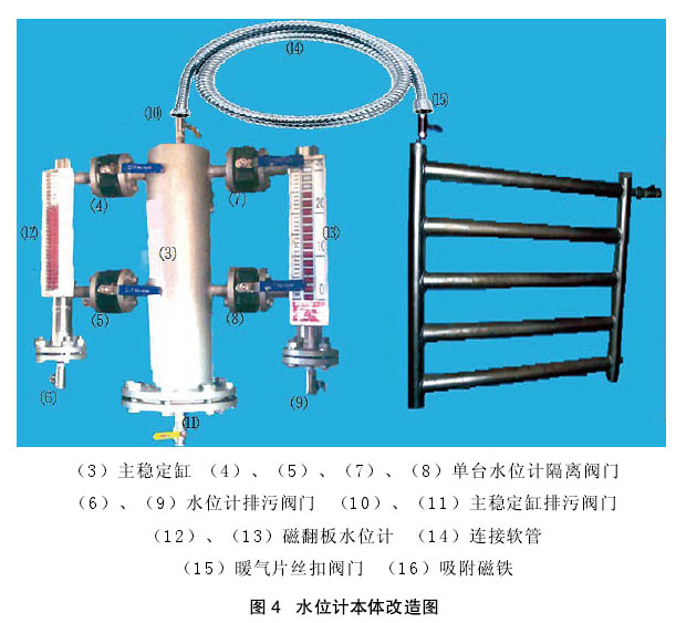 自2009年以來,公司先后對水位計進行了5次改進:安裝磁鐵吸附雜質、擴大連通管徑并安裝隔離控制閥門、擴大穩定缸容積、實行雙水位計并聯讀數及安裝沖洗閥門,改進前如圖1所示。
