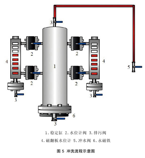 (2)拆下永磁鐵關閉4個水位計閥,打開穩定缸上、下閥及閥門5,單獨沖洗主穩定缸。