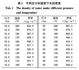 在實(shí)際過(guò)程中,加熱器中不同位置的水溫是不一致的,它和加熱器的形狀、體積等條件有關(guān),同理在測(cè)量通道中不同位置的水溫也是不一致的。這會(huì)對(duì)理論計(jì)算造成較大的困難,在此對(duì)容器中水的溫度分布做了簡(jiǎn)化。如圖1所示,在閥門(mén)V的左端為加熱器的水溫,假設(shè)水溫一致,且都為T(mén)1,在閥門(mén)V的右端為測(cè)量通道的水溫,設(shè)水溫一致,且都為T(mén)2。在加熱器額定工作壓力P的情形下,T1溫度和T2溫度下對(duì)應(yīng)的水的密度分別為ρ1和ρ2。在閥門(mén)V處,左端的壓力等于右端的壓力,由此可得: