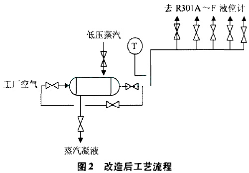 此次試驗的成功為徹底解決乙烯球罐磁翻板結(jié)冰提供了寶貴的經(jīng)驗,因此將試驗期間所用的臨時管線和設(shè)備經(jīng)過進(jìn)一步完善,于2016年4月底完成全部乙烯球罐(R301A-F)耐酸堿磁翻板液位計的改造,液位計上的空氣吹掃管為自制設(shè)備,進(jìn)氣端裝一閥門用于調(diào)節(jié)空氣量,另一端封閉,在靠進(jìn)液位計翻板側(cè)每間斷開5cm一個中的孔用于空氣吹掃為保證吹掃空氣的溫度在加熱器出入口增加一旁線,流程見圖2。