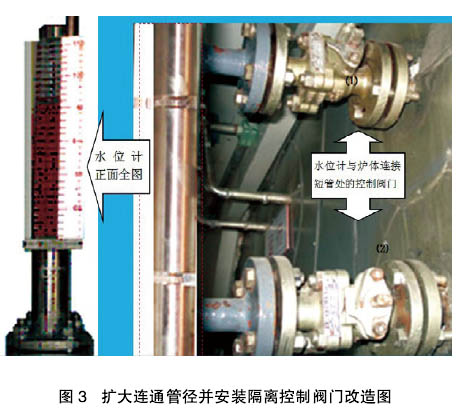 自2009年以來,公司先后對水位計進行了5次改進:安裝磁鐵吸附雜質、擴大連通管徑并安裝隔離控制閥門、擴大穩定缸容積、實行雙水位計并聯讀數及安裝沖洗閥門,改進前如圖1所示。