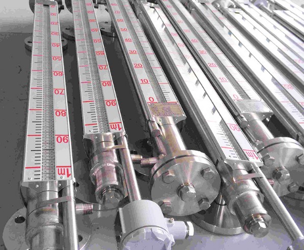 根據浮力原理,浮子在測量管內隨液位的升降而上、下移動,浮子內的永久磁鋼通過耦合作用,驅動紅、白色翻柱翻轉180°,液位上升時翻柱由白色轉為紅色,下降時由紅色轉為白色,從而實現液位指示。