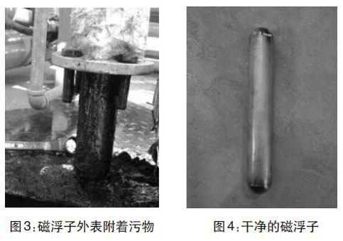 經(jīng)過兩年多運行,污水罐內(nèi)可能沉淀污泥雜質(zhì)導(dǎo)致液位計示數(shù)不準(zhǔn)?,F(xiàn)場拆卸液位計,并且對浮球和磁浮子進行清洗。(圖3-圖4)