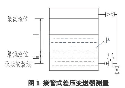 圖1中,P 1為介質(zhì)密度,H。為液位起始點。差壓變送器與液體導管為水平安裝,只要確定氣相管內(nèi)無冷凝液,當液位密度穩(wěn)定時,即可準確測量液體的高度。但在液氨儲罐的液位測量過程中,氣相管內(nèi)的氣氨會隨環(huán)境瘟度的變化而冷凝,產(chǎn)生壓差,故這種接管式的差壓測量方法不適用于液氮儲罐的測量。