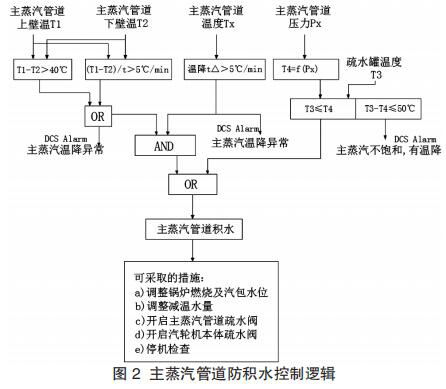 結(jié)合主蒸汽管道積水的上下壁溫差法與疏水罐測溫法結(jié)合自動(dòng)檢測方法, 主蒸汽管道防積水可以采用如圖 2 所示中的控制邏輯與策略。