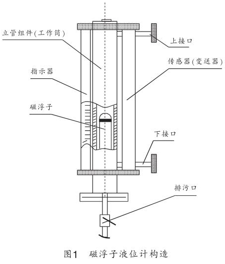 遠(yuǎn)傳式側(cè)裝磁翻板液位計(jì)由磁浮子、工作筒、指示器、遠(yuǎn)傳變送器組成,如圖 1 所示。