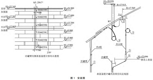 以昆侖能源華油天然氣四川廣安液化天然氣2萬(wàn)方儲(chǔ)罐為例,在安裝多點(diǎn)溫度計(jì)過程中,內(nèi)罐底部溫度熱電阻需要從內(nèi)罐浮頂進(jìn)入罐內(nèi),沿罐壁垂直向下固定在罐底部。如需夾層底部溫度測(cè)量,則需要將溫度熱電阻沿外罐壁垂直而下,固定在罐底夾層的氮?dú)夤苌希块g隔4m布置1個(gè)電纜固線器,如圖1所示。