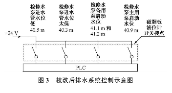 它結構是利用旁通管的原理,主導管內的液位和尾水管內的液位高度一致,根據阿基米德定理,磁性浮子在液體中產生的浮力和重力平衡,當尾水管中的水位升降時,液位計主導管內的浮子也隨之升降,浮子內的永久磁鐵通過磁耦合驅動指示器內的翻板指示器,當液位上升或下降時,翻板指示器由白色翻轉為紅色,或由原來的紅色翻轉為白色,指示器的顏色改變的高度就是被測水位的實際高度,從而實現液位的現場指示,以供運行人員目測尾水管的實時水位。安裝于液位計管壁外側的磁記憶開關,可多點設置、滑動調整位置,提供了液位開關量報警功能。在裝置的頂部安裝了一個自動排氣裝置,當主導管內液位上升時能夠自動的排氣,下降時能夠按時補氣?,F場安裝耐高溫磁翻板液位計時,裝置標尺的0位,對應的實地高程為EL.40.0m。浮子開關設定5個水位動作值,檢修水位低開關量報警值對應的高程為40.3m;停止所有檢修水泵的開關量,所對應的高程為40.5m;啟動主用檢修水泵的開關量,所對應的高程為40.9m;啟動檢修水泵主用泵的開關量,以及要求手動啟動大泵,并作為水位高報警上送上位機,所對應的高程為41.1m與41.2m,兩個開關量并列接入。全部開關量分別送入PLC,如圖3所示。