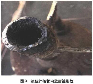 分離罐液位計接管先于罐體腐蝕泄漏失效是由于管壁較薄加之外表面防腐保溫不完整導(dǎo)致雨水侵人常年腐蝕所致。對此應(yīng)引起設(shè)計、制造、使用及檢驗(yàn)等相關(guān)各方為戒。