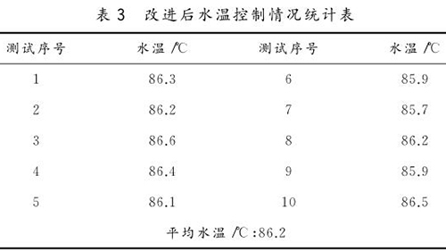 熱水裝置改進完成后,*大地降低了由其引發的設備故障,到目前為止未發生一次設備故障;降低了加熱元件工作時水箱的震動和噪聲;提高了水溫的控制精度。在設定水溫為85℃情況下,進行了10次測試,平均水溫為86.2℃(表3),水溫的波動情況由改進前4.2℃降低到1.2℃。