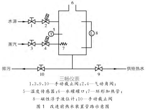 WQ39型葉絲超級回潮筒的熱水裝置于2004年4月投入生產使用,主要由水源、蒸汽源、角閥、手動截止閥、環形加熱管、溫度傳感器和浮球磁翻板液位計等組成。改進前熱水裝置管路示意圖如圖1所示。