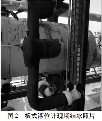 制冷系統調試運行時,發現防霜磁翻板液位計的底部開始有氨氣泡形成,徐徐上升到液面消失,并且液面上下浮動,幅度較大,不能穩定在某一位置內。隨著系統的運行,液位計的下部開始結露、結霜,結霜高度逐漸增加,并由霜轉化為冰,無法觀察到液位,見圖 2。同時,螺桿式制冷壓縮機出現了“潮車”現象。由于操作者無法判斷液位的準確位置,為防止事故發生,被迫停機,嚴重影響了物料的生產。