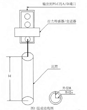 沉筒式液位計(jì)主要由拉力傳感器、變送器及沉筒組成,拉力傳感器內(nèi)部貼有電阻應(yīng)變片,通過信號(hào)線將變送器輸出的標(biāo)準(zhǔn)電流信號(hào)送到PLC的A/D輸入端口,用以進(jìn)行數(shù)據(jù)處理和遠(yuǎn)程控制。沉筒由上下兩端封閉的空心材料制成,并懸掛在拉力傳感器的受力端,其余部分投入到儲(chǔ)料罐中,拉力傳感器用法蘭盤或自帶螺紋固定在儲(chǔ)料罐的上方,結(jié)構(gòu)如圖1所示。