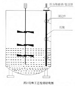 在某些工業(yè)材料的制備過程中需要用到攪拌使材料混合均勻,達(dá)到工業(yè)用料的要求。即使液體始終處于攪拌狀態(tài)下,液體表面波動(dòng)較大,罐體還有明顯的震動(dòng),再加上蒸汽、粉塵等比較惡劣的環(huán)境,傳統(tǒng)的液位檢測(cè)裝置無(wú)法正常工作。利用這種沉筒式液位計(jì)能很好的解決這一問題,并且能夠通過軟件去除誤差相對(duì)較大的數(shù)據(jù),保證檢測(cè)的精確性,其檢測(cè)結(jié)構(gòu)如圖2所示。