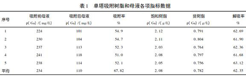 (1) 技改原理: 新樹脂入廠檢驗,飽和樹脂容量可以達到 2. 5 ~ 2. 8g /L。但在實際生產中由于含液位計母液的通過量不足,造成樹脂的吸附率較低,新樹脂飽和樹脂容量一般在 2. 0 ~ 2. 2g /L 之間。通過再增加一組吸附塔來進行雙塔吸附,即提高了樹脂利用率,又充分利用了母液,提高樹脂的飽和度。采用雙塔交叉吸附工藝的升級改造,是在原有單塔吸附的基礎上增加一個吸附塔和一臺母液進塔泵。兩臺母液進塔泵分別向兩個吸附塔同時供液樹脂吸附飽和后,兩個吸附塔樹脂交叉進行下步解吸工藝。表 1為單塔吸附工藝生產中取用的一組數。