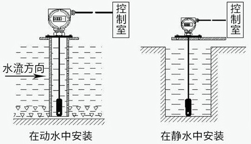 1、液位計安裝在靜止的深井、水池中時,通常把內徑Φ45mm左右的鋼管 (不同高度打若干小孔,以便水通暢進 入管內)固定于水中,然后將投入式液位變送器放入鋼管中即可使用。