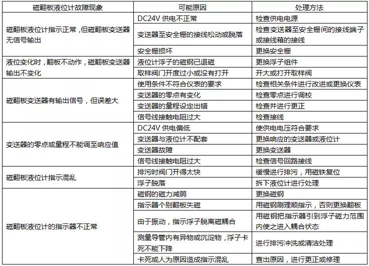 5、側裝式磁性液位計常見故障的檢查及處理如表1所示