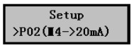 1)在污水液位計正常工作時按擊Mode鍵進入參數設置菜單后按擊▼鍵選擇P02(4~20mA)設置菜單,如右圖。