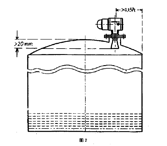 ①喇叭口天線的下端必須低于罐頂20mm以上,法蘭對水平面的誤差應小于±0.5°,喇叭天線的中軸線應保證與液面垂直,且距罐壁的*小安裝距離不能小于0.15H ( H為罐高)。(如圖2)