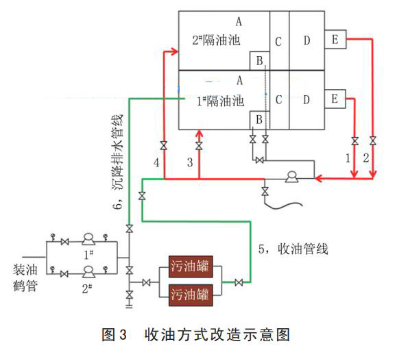 針對拉運頻次高,成本費用高,危廢產量大的問題,將原環保試驗污水罐改造為污油暫存罐,增設隔油池收油池至污油罐流程 (圖 3,流程 5),將收集的污油集中在污油罐內,達到一定液位后,用罐車拉運至輪南環保站。該措施提高了污油儲存容積,大大降低了罐車拉運頻次。同時,增加污油暫存罐至隔油池流程 (圖 3,流程 6),罐內污油重力沉降后,底部污水壓排至隔油池,降低了污油中混水比例,大大減少了轉運危廢的數量。