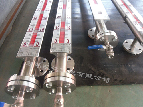 液位計(jì)根據(jù)浮力原理,浮子在測(cè)量管內(nèi)隨液位的升降而上下移動(dòng),浮子內(nèi)的永久磁鋼通過磁耦合作用,驅(qū)動(dòng)紅、白色翻柱翻轉(zhuǎn)180’液位上升時(shí),翻柱由白色轉(zhuǎn)為紅色,下降時(shí),翻柱由紅色轉(zhuǎn)為白色,從而實(shí)現(xiàn)液位的指示。