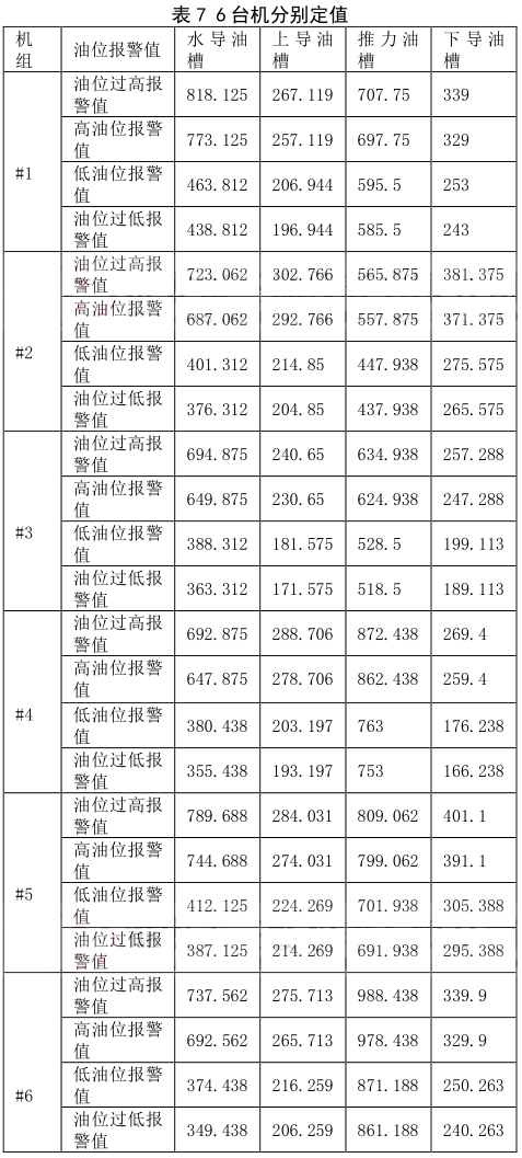 (2)依據(jù)成都勘測(cè)設(shè)計(jì)院給的定值要求,建議每臺(tái)機(jī)設(shè)置不同的報(bào)警值。設(shè)置原則:在上導(dǎo)、下導(dǎo)、推力各部油槽油位,結(jié)合機(jī)組運(yùn)行時(shí)的油位*大值上設(shè)置高油位報(bào)警值+20mm、過高油位報(bào)警值 +30mm;*低油位值上低油位報(bào)警值 -20mm、低油位停機(jī)值 -30mm;水導(dǎo)油槽油位:高油位報(bào)警值 +45mm、過高油位報(bào)警值 +90mm;*低油位值上低油位報(bào)警值 -130mm、低油位停機(jī)值 -155mm;躲過報(bào)警值。在此基礎(chǔ)上,真實(shí)的油位只會(huì)下降,設(shè)置值對(duì)油位的運(yùn)行是安全的。分析確定的#1-#6 機(jī)組各油槽油位的動(dòng)態(tài)油位報(bào)警值,即機(jī)組運(yùn)行時(shí)油槽油位的過低、低、高、過高報(bào)警定值如下,可以選擇表 9 的數(shù)據(jù) 6 臺(tái)機(jī)分別進(jìn)行定值,同時(shí)也提供定值表 10 進(jìn)行 6 臺(tái)機(jī)統(tǒng)一進(jìn)行定值。