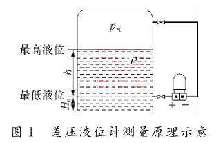 在粉煤加壓氣化工藝流程中,冷卻水、冷凝水是干凈潔凈的介質,測量該介質的液位如無特殊情況,選用普通的差壓式液位計即可。差壓式液位計是利用流體靜力學原理,通過測量流體的壓差來計算出液位的高低,其測量原理如圖1所示。這種方法簡捷、方便,但是準確度與穩定性不高,而且測量結果受到介質密度的影響,為滿足測量精度常需要進行補償或采用組合式儀表測量方案。