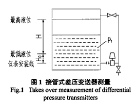 圖1中,ρ1為介質密度,Ho為液位起始點。差壓變送器與液體導管為水平安裝,只要確定氣相管內無冷凝液,當液位密度穩定時,即可準確測量液體的高度。但在液氨儲罐的液位測量過程中,氣相管內的氣氨會隨環境瘟度的變化而冷凝,產生壓差,故這種接管式的差壓測量方法不適用于液氮儲罐的測量。