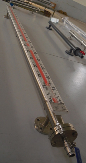 根據浮力原理,浮子在測量管內隨液位的升降而上、下移動,浮子內的永久磁鋼通過耦合作用,驅動紅、白色翻柱翻轉180°,液位上升時翻柱由白色轉為紅色,下降時由紅色轉為白色,從而實現液位指示。